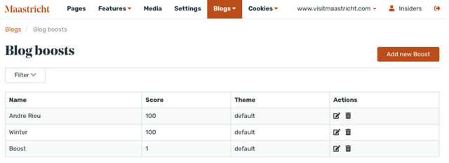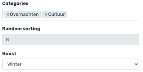 Artikelen kun je voorzien van een Boost. Deze Boost is gekoppeld aan een periode en een score. Je kunt deze Boost vervolgens aan meerdere artikelen koppelen. Dat is handig als je meerdere artikelen in 1x wilt boosten in een bepaalde periode (bijv: In de winter wil je winter-gerelateerde artikelen bovenaan in je overzichten).