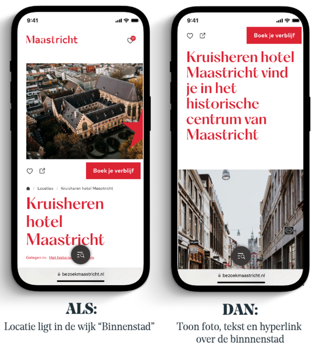 Je kunt de locatie en eventpagina’s op je website verrijken met gebiedsinformatie. Dat betekent concreet dat als een bezoeker van jouw website een hotel aan het bekijken is, jij hem meteen meer kunt vertellen over het gebied waar het hotel in ligt. Het gebied kan een wijk, gemeente of zelfs een provincie zijn.
